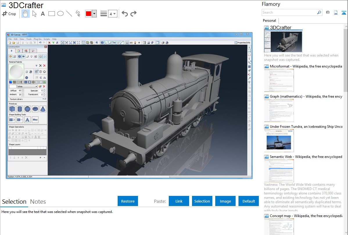 Flamory helps you capture and store screenshots from 3DCrafter by pressing a single hotkey. It will be saved to a history, so you can continue doing your tasks without interruptions. Later, you can edit the screenshot: crop, resize, add labels and highlights. After that, you can paste the screenshot into any other document or e-mail message.
