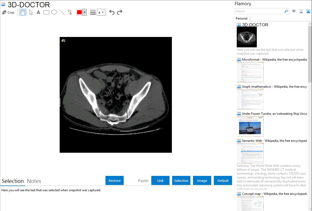 Flamory helps you capture and store screenshots from 3D-DOCTOR by pressing a single hotkey. It will be saved to a history, so you can continue doing your tasks without interruptions. Later, you can edit the screenshot: crop, resize, add labels and highlights. After that, you can paste the screenshot into any other document or e-mail message.
