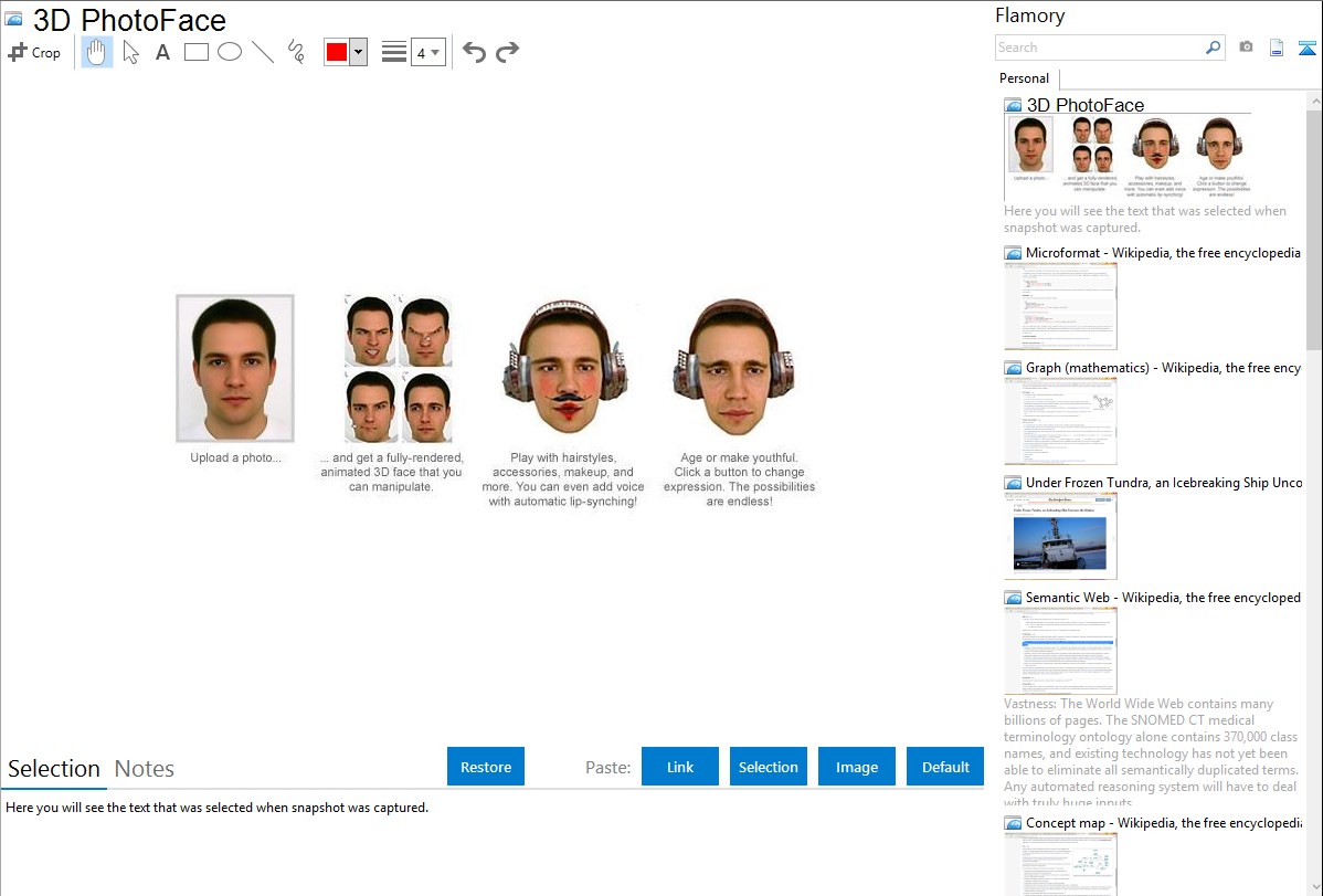Flamory provides advanced bookmarking for 3D PhotoFace. It captures screen, selection, text on the page and other context. You can find this bookmark later using search by page content or looking through thumbnail list.