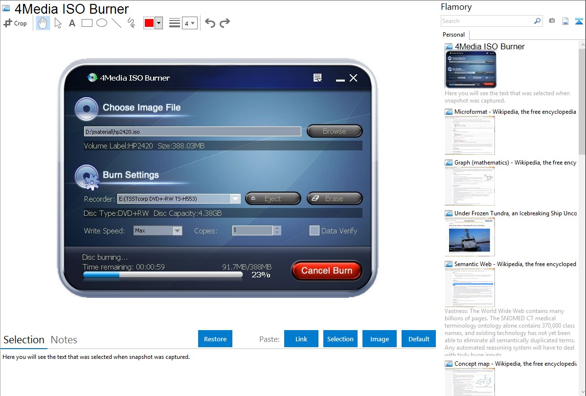 Flamory helps you capture and store screenshots from 4Media ISO Burner by pressing a single hotkey. It will be saved to a history, so you can continue doing your tasks without interruptions. Later, you can edit the screenshot: crop, resize, add labels and highlights. After that, you can paste the screenshot into any other document or e-mail message.