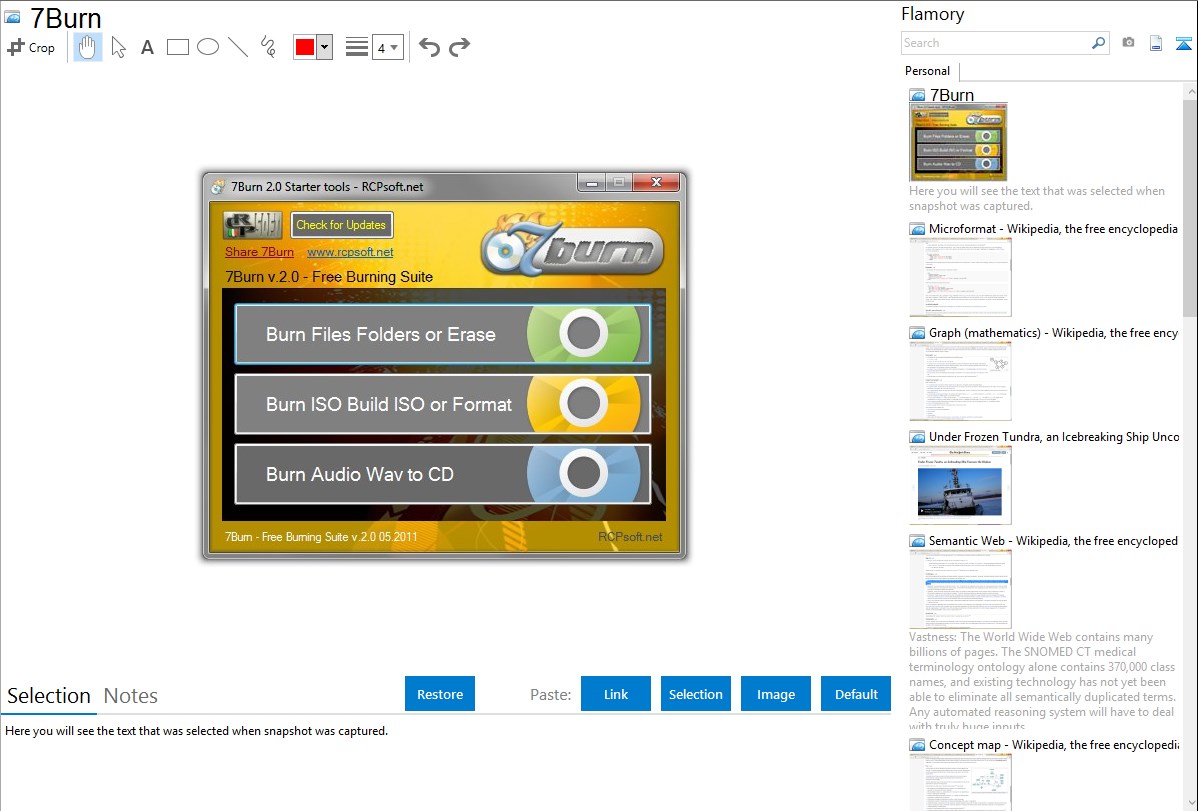 Flamory helps you capture and store screenshots from 7Burn by pressing a single hotkey. It will be saved to a history, so you can continue doing your tasks without interruptions. Later, you can edit the screenshot: crop, resize, add labels and highlights. After that, you can paste the screenshot into any other document or e-mail message.