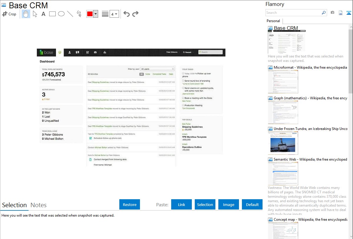 Flamory helps you capture and store screenshots from Base CRM by pressing a single hotkey. It will be saved to a history, so you can continue doing your tasks without interruptions. Later, you can edit the screenshot: crop, resize, add labels and highlights. After that, you can paste the screenshot into any other document or e-mail message.