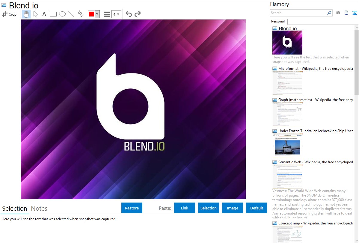 Flamory helps you capture and store screenshots from Blend.io by pressing a single hotkey. It will be saved to a history, so you can continue doing your tasks without interruptions. Later, you can edit the screenshot: crop, resize, add labels and highlights. After that, you can paste the screenshot into any other document or e-mail message.