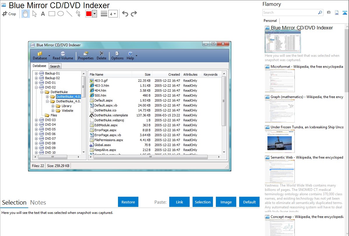 Flamory helps you capture and store screenshots from Blue Mirror CD/DVD Indexer by pressing a single hotkey. It will be saved to a history, so you can continue doing your tasks without interruptions. Later, you can edit the screenshot: crop, resize, add labels and highlights. After that, you can paste the screenshot into any other document or e-mail message.