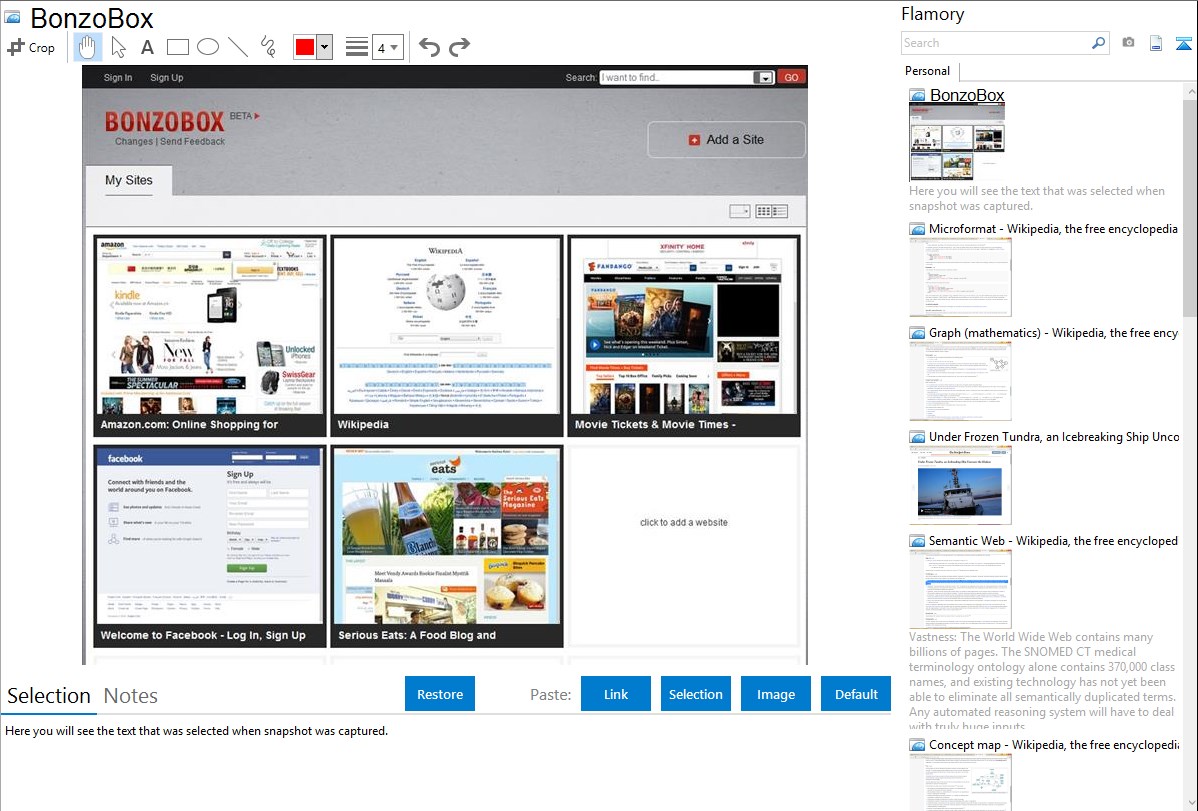 Flamory helps you capture and store screenshots from BonzoBox by pressing a single hotkey. It will be saved to a history, so you can continue doing your tasks without interruptions. Later, you can edit the screenshot: crop, resize, add labels and highlights. After that, you can paste the screenshot into any other document or e-mail message.