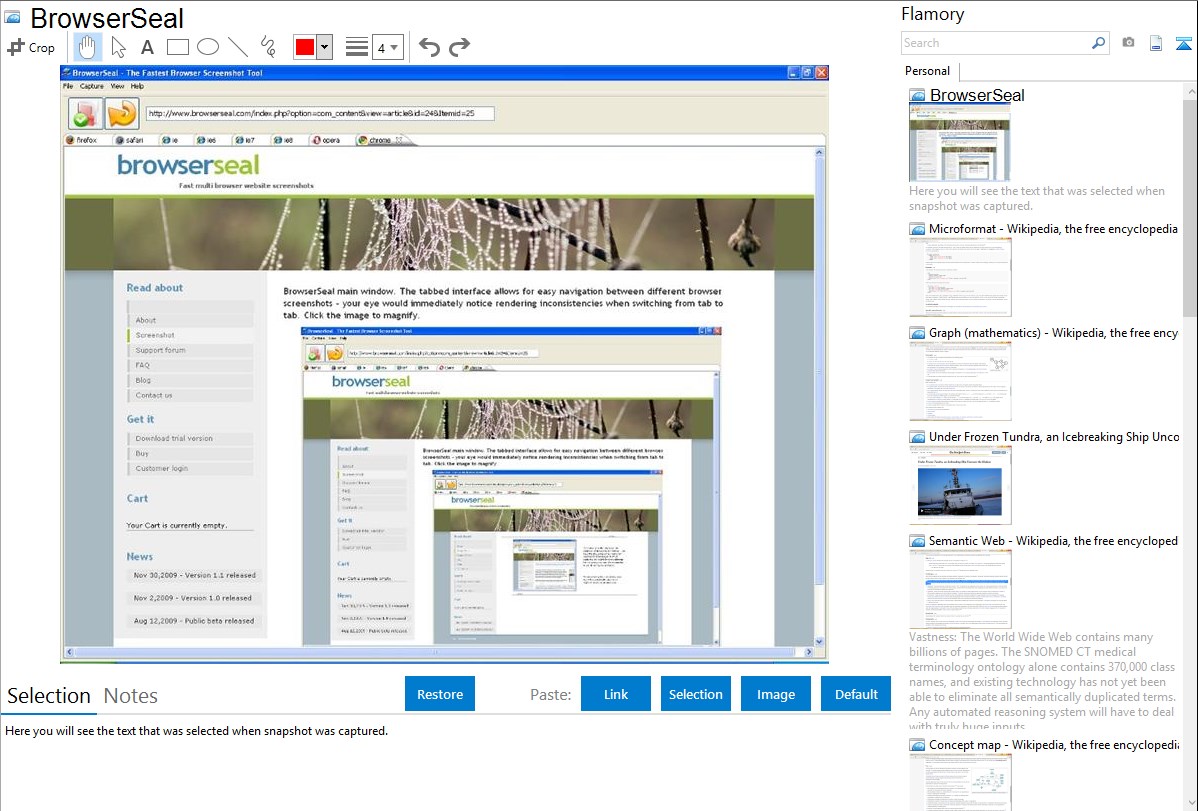 Flamory helps you capture and store screenshots from BrowserSeal by pressing a single hotkey. It will be saved to a history, so you can continue doing your tasks without interruptions. Later, you can edit the screenshot: crop, resize, add labels and highlights. After that, you can paste the screenshot into any other document or e-mail message.