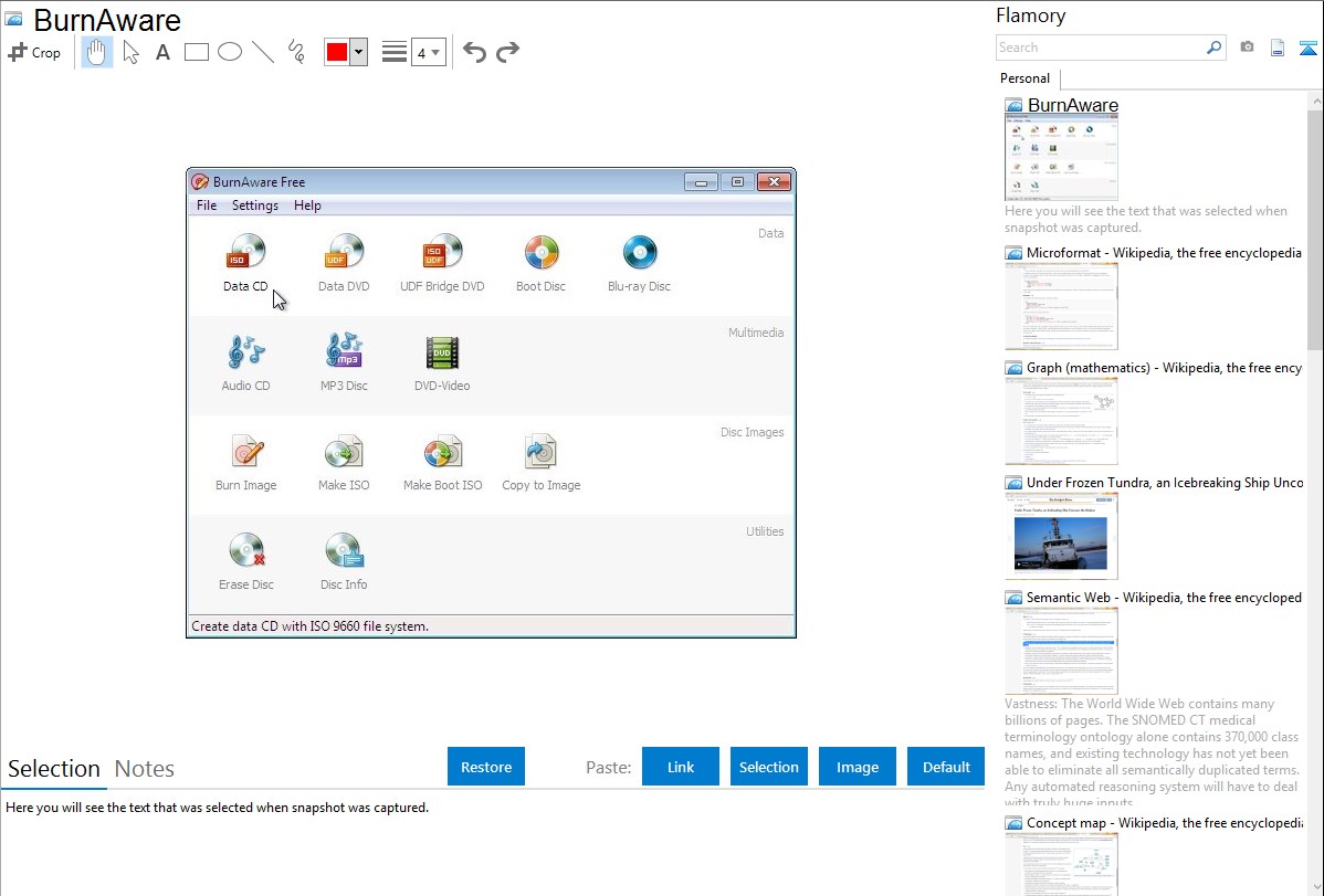 Flamory helps you capture and store screenshots from BurnAware by pressing a single hotkey. It will be saved to a history, so you can continue doing your tasks without interruptions. Later, you can edit the screenshot: crop, resize, add labels and highlights. After that, you can paste the screenshot into any other document or e-mail message.