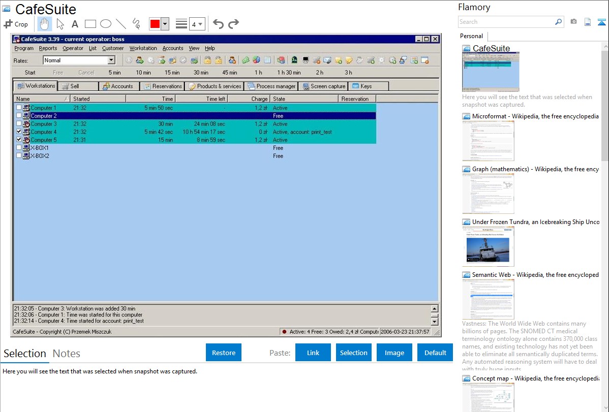 Flamory helps you capture and store screenshots from CafeSuite by pressing a single hotkey. It will be saved to a history, so you can continue doing your tasks without interruptions. Later, you can edit the screenshot: crop, resize, add labels and highlights. After that, you can paste the screenshot into any other document or e-mail message.