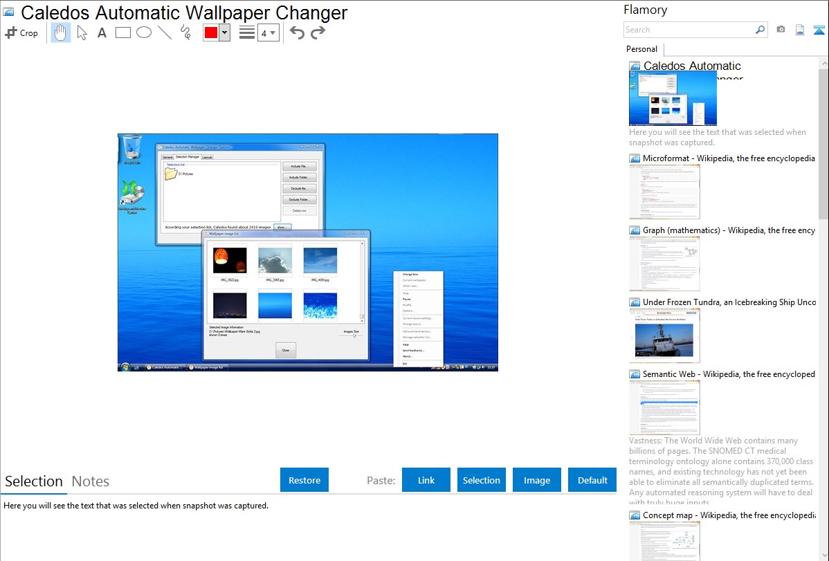 Flamory helps you capture and store screenshots from Caledos Automatic Wallpaper Changer by pressing a single hotkey. It will be saved to a history, so you can continue doing your tasks without interruptions. Later, you can edit the screenshot: crop, resize, add labels and highlights. After that, you can paste the screenshot into any other document or e-mail message.