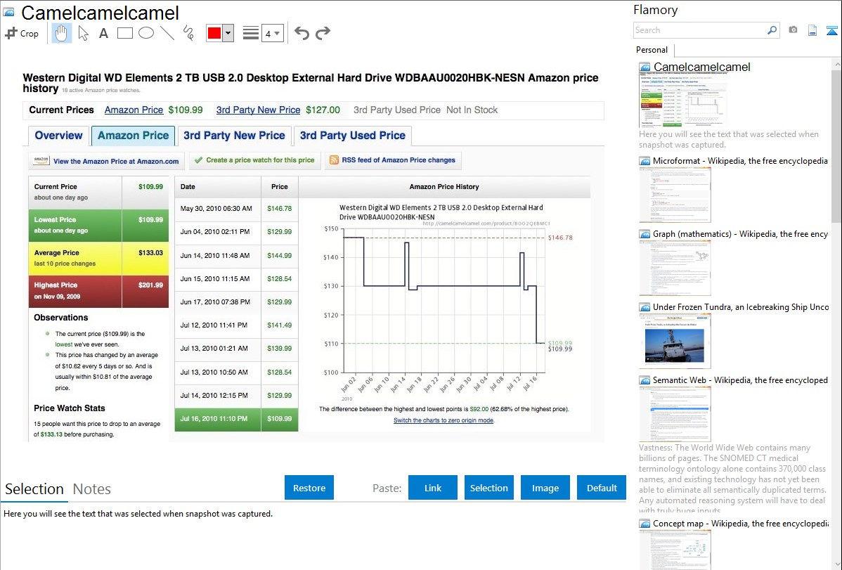 Flamory provides advanced bookmarking for Camelcamelcamel. It captures screen, selection, text on the page and other context. You can find this bookmark later using search by page content or looking through thumbnail list.