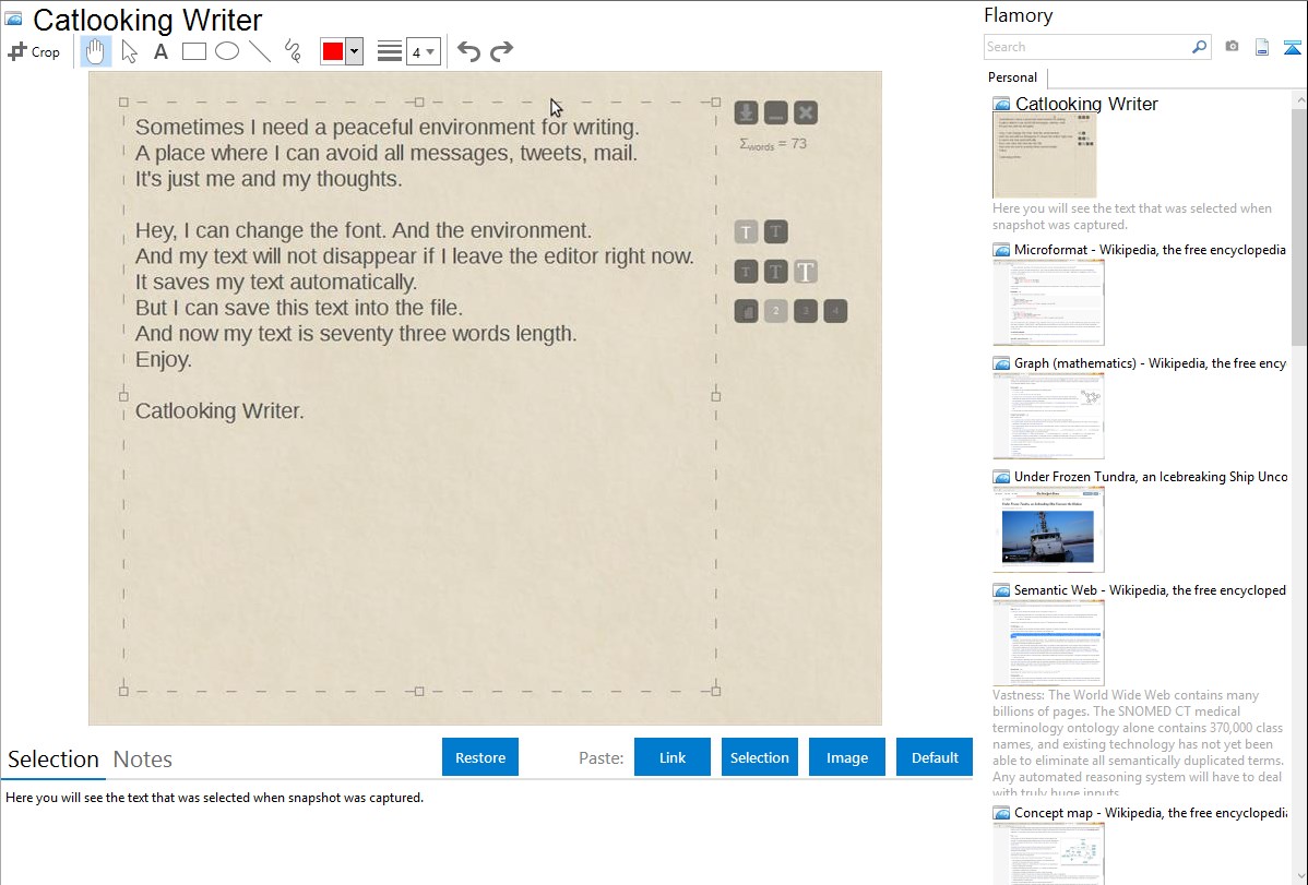 Flamory helps you capture and store screenshots from Catlooking Writer by pressing a single hotkey. It will be saved to a history, so you can continue doing your tasks without interruptions. Later, you can edit the screenshot: crop, resize, add labels and highlights. After that, you can paste the screenshot into any other document or e-mail message.