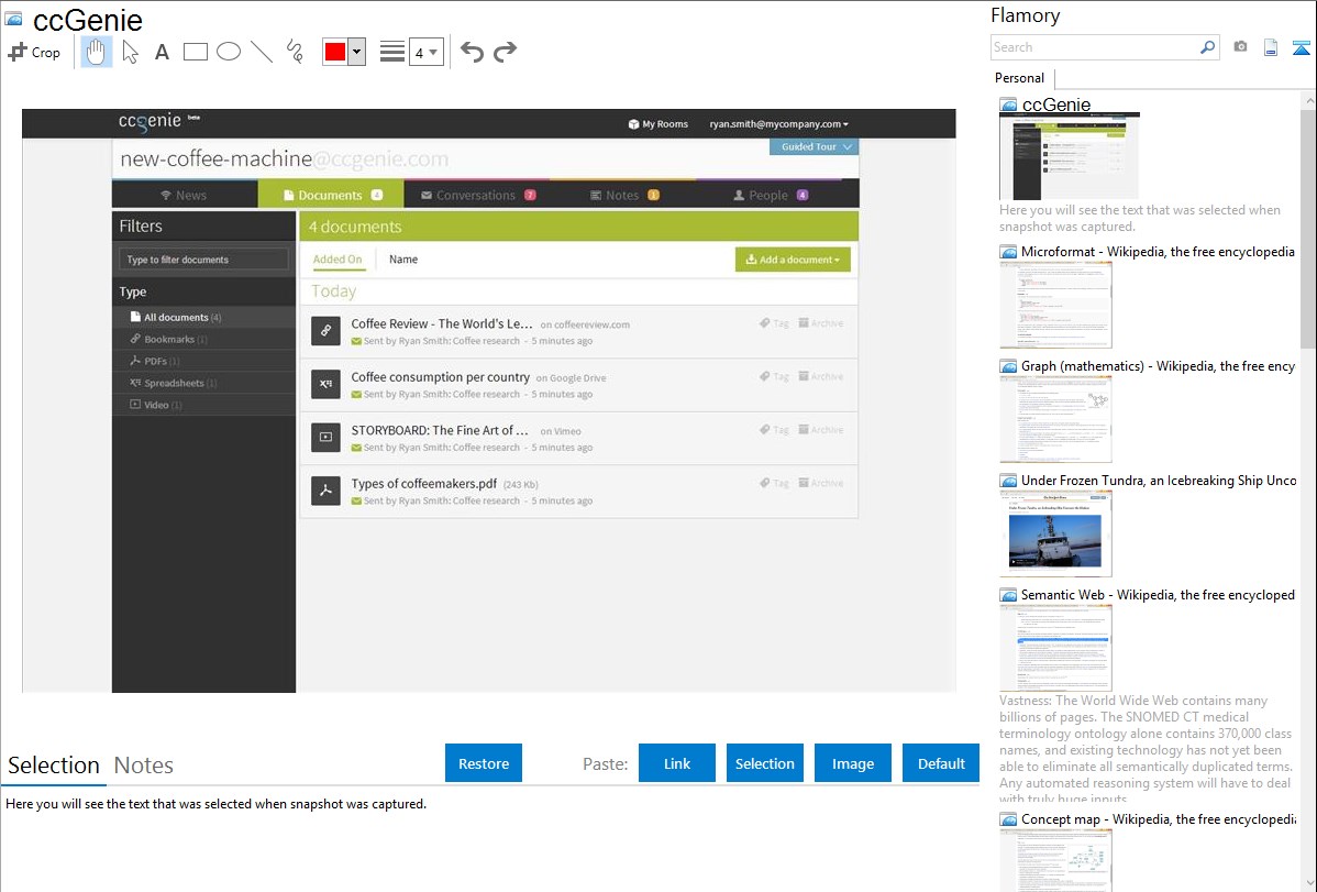 Flamory helps you capture and store screenshots from ccGenie by pressing a single hotkey. It will be saved to a history, so you can continue doing your tasks without interruptions. Later, you can edit the screenshot: crop, resize, add labels and highlights. After that, you can paste the screenshot into any other document or e-mail message.