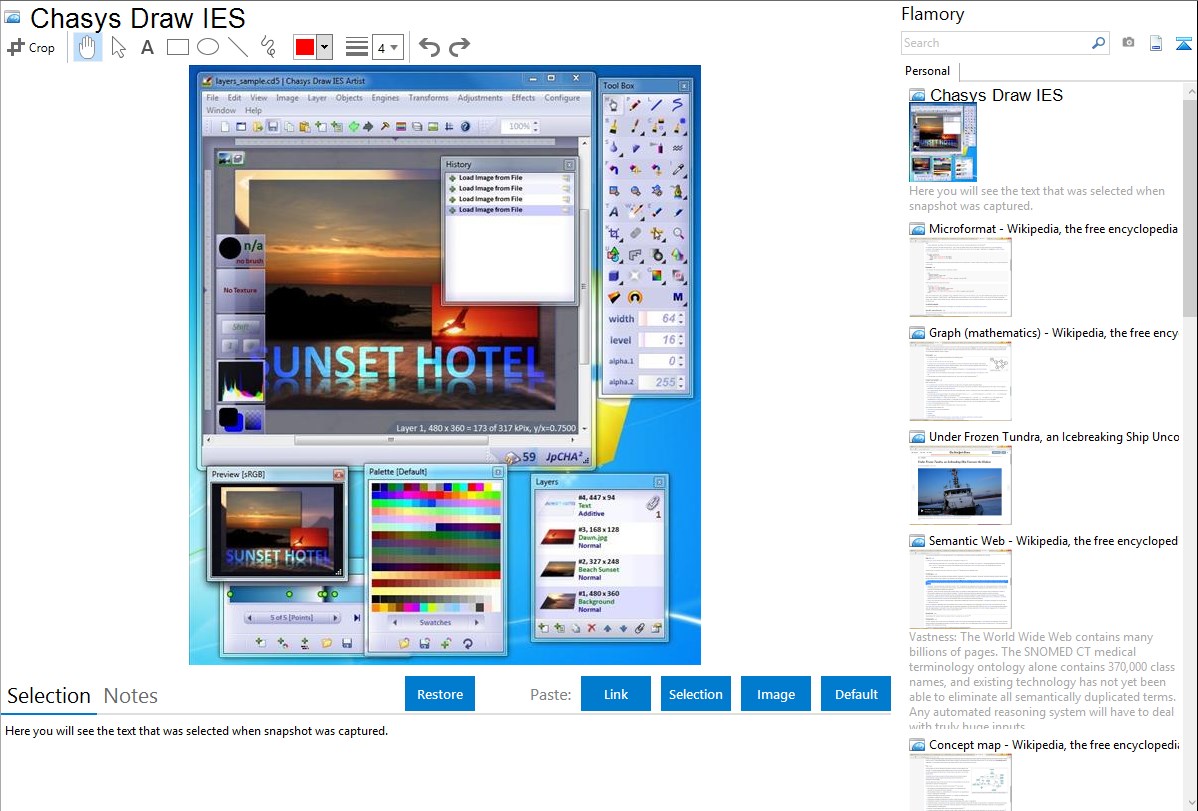 Flamory helps you capture and store screenshots from Chasys Draw IES by pressing a single hotkey. It will be saved to a history, so you can continue doing your tasks without interruptions. Later, you can edit the screenshot: crop, resize, add labels and highlights. After that, you can paste the screenshot into any other document or e-mail message.