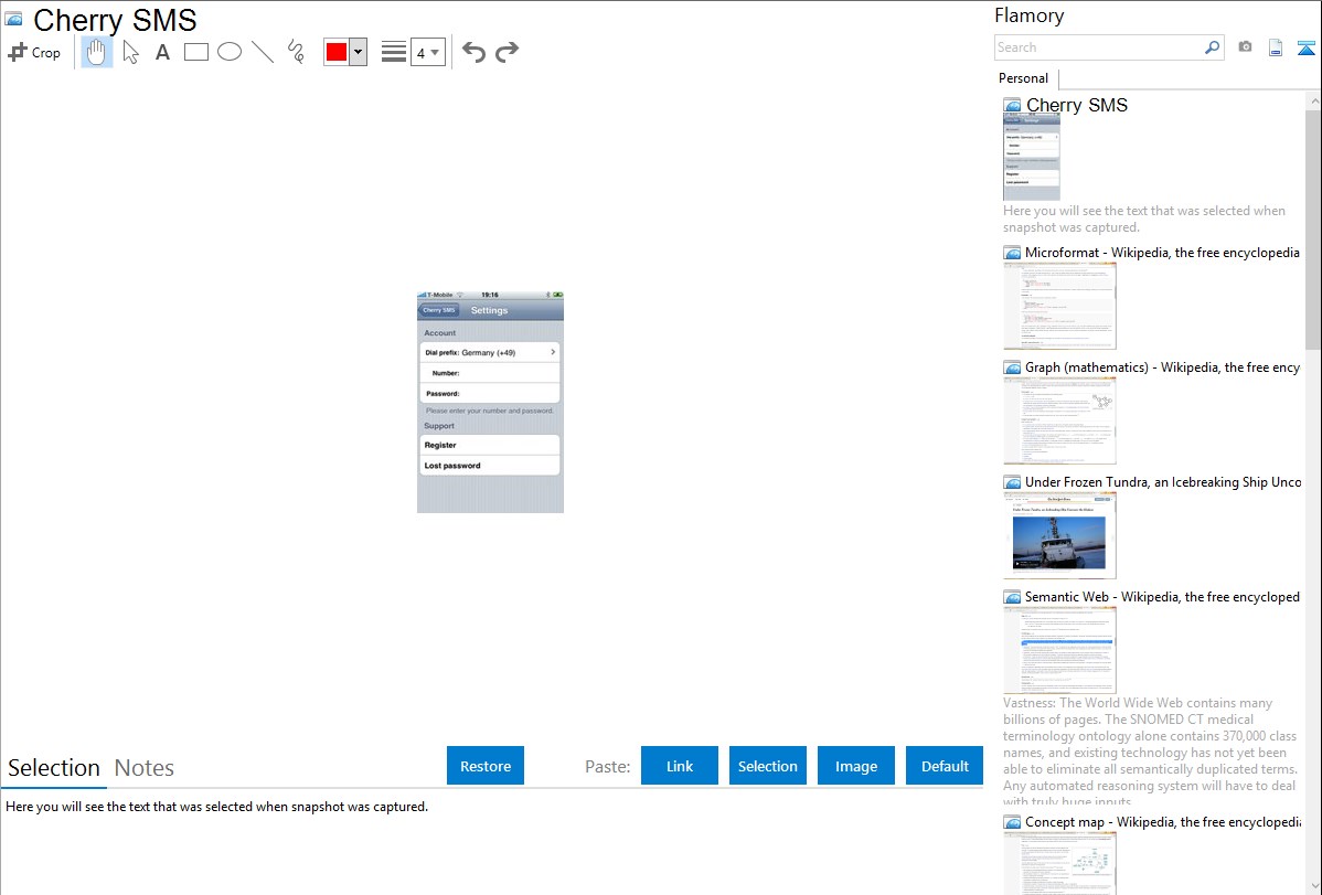 Flamory helps you capture and store screenshots from Cherry SMS by pressing a single hotkey. It will be saved to a history, so you can continue doing your tasks without interruptions. Later, you can edit the screenshot: crop, resize, add labels and highlights. After that, you can paste the screenshot into any other document or e-mail message.