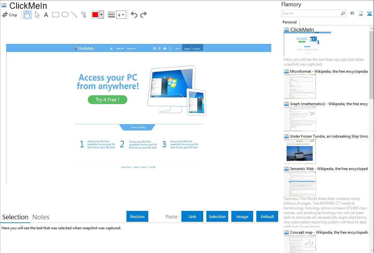 Flamory helps you capture and store screenshots from ClickMeIn by pressing a single hotkey. It will be saved to a history, so you can continue doing your tasks without interruptions. Later, you can edit the screenshot: crop, resize, add labels and highlights. After that, you can paste the screenshot into any other document or e-mail message.