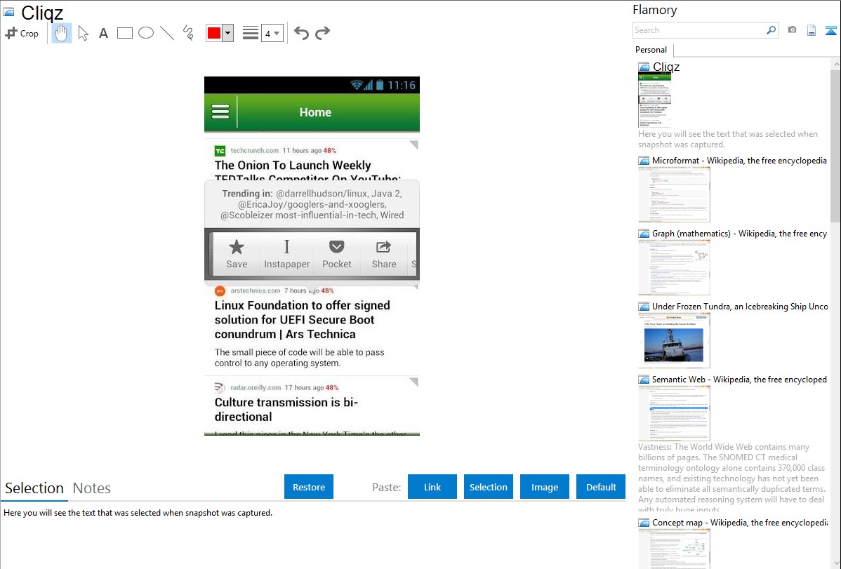 Flamory helps you capture and store screenshots from Cliqz by pressing a single hotkey. It will be saved to a history, so you can continue doing your tasks without interruptions. Later, you can edit the screenshot: crop, resize, add labels and highlights. After that, you can paste the screenshot into any other document or e-mail message.
