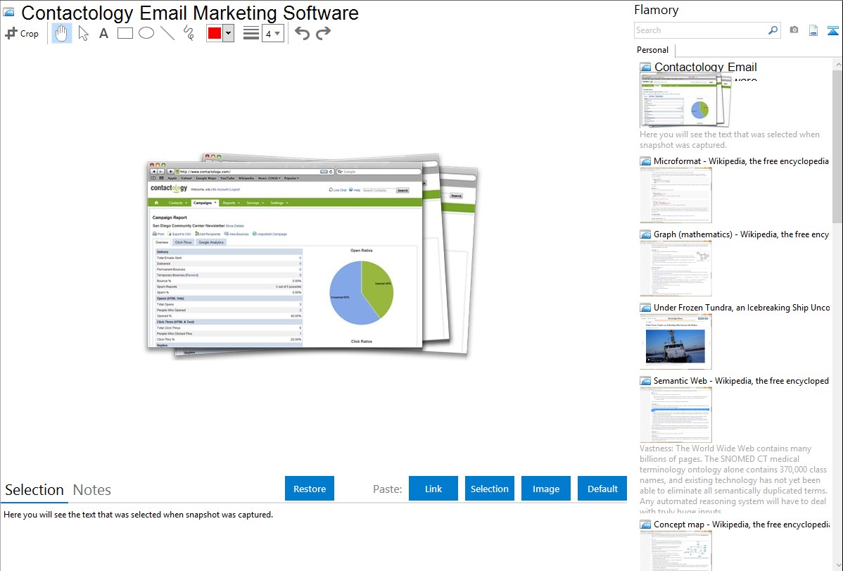 Flamory provides advanced bookmarking for Contactology Email Marketing Software. It captures screen, selection, text on the page and other context. You can find this bookmark later using search by page content or looking through thumbnail list.