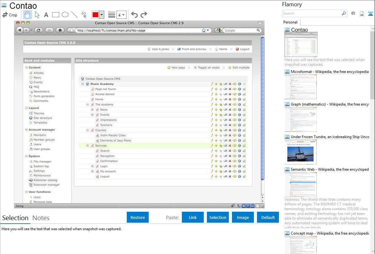 Flamory helps you capture and store screenshots from Contao by pressing a single hotkey. It will be saved to a history, so you can continue doing your tasks without interruptions. Later, you can edit the screenshot: crop, resize, add labels and highlights. After that, you can paste the screenshot into any other document or e-mail message.