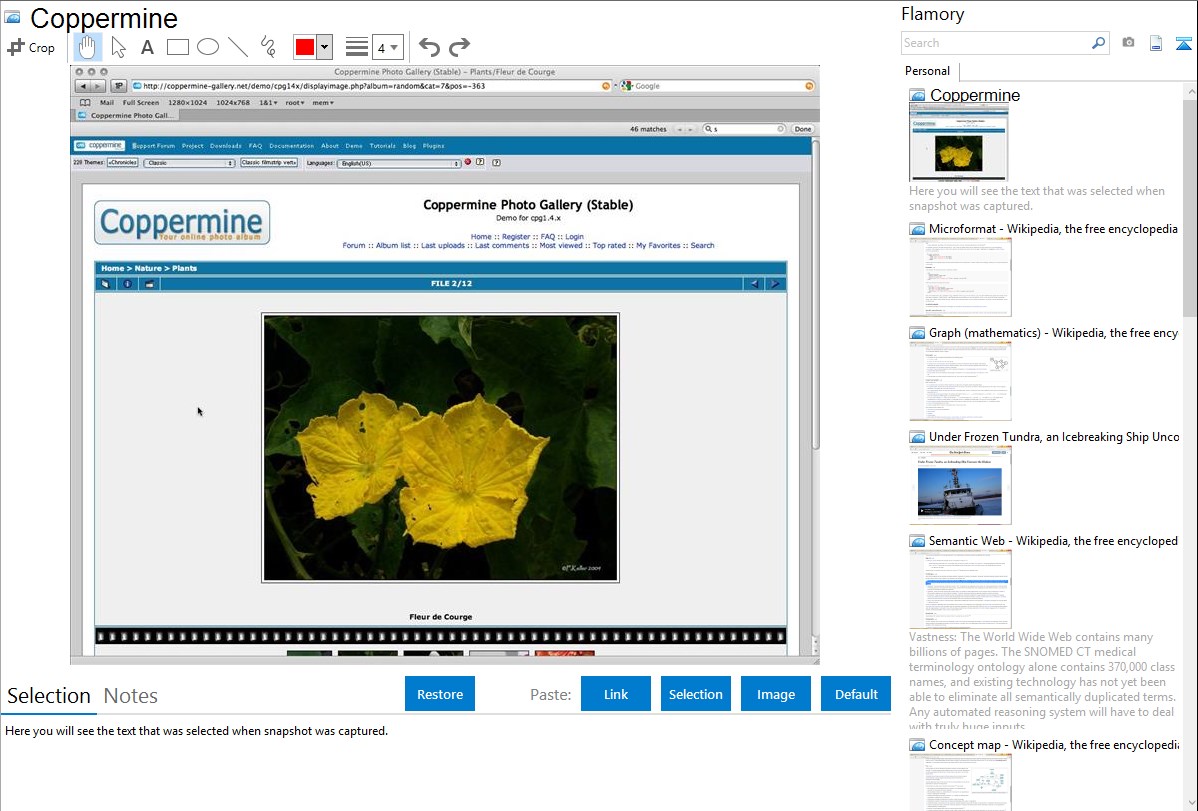 Flamory helps you capture and store screenshots from Coppermine by pressing a single hotkey. It will be saved to a history, so you can continue doing your tasks without interruptions. Later, you can edit the screenshot: crop, resize, add labels and highlights. After that, you can paste the screenshot into any other document or e-mail message.
