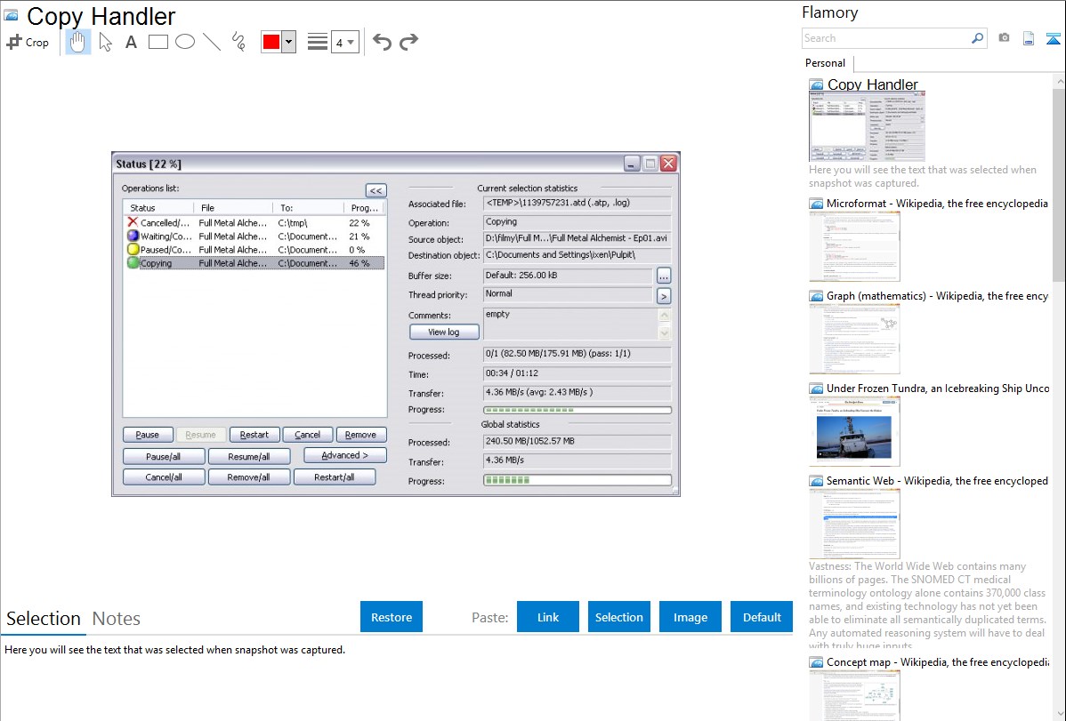 Flamory helps you capture and store screenshots from Copy Handler by pressing a single hotkey. It will be saved to a history, so you can continue doing your tasks without interruptions. Later, you can edit the screenshot: crop, resize, add labels and highlights. After that, you can paste the screenshot into any other document or e-mail message.