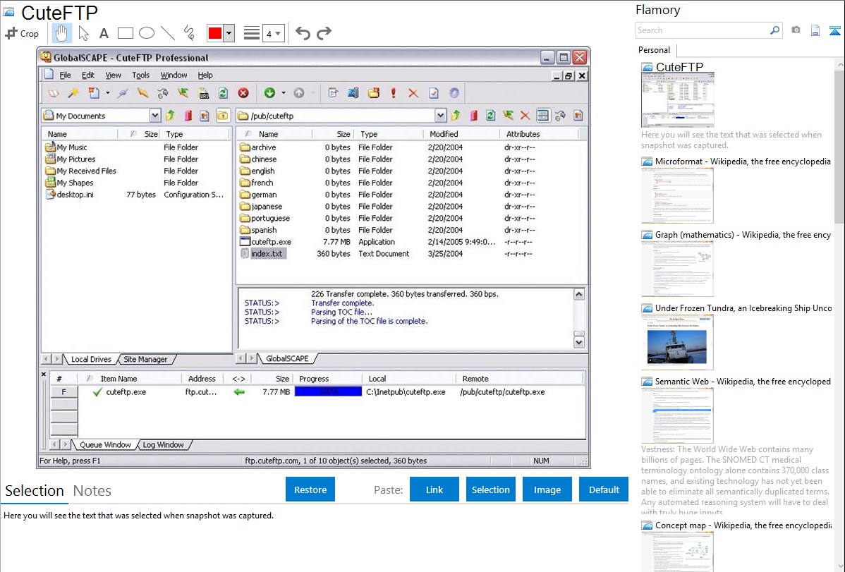 Flamory helps you capture and store screenshots from CuteFTP by pressing a single hotkey. It will be saved to a history, so you can continue doing your tasks without interruptions. Later, you can edit the screenshot: crop, resize, add labels and highlights. After that, you can paste the screenshot into any other document or e-mail message.