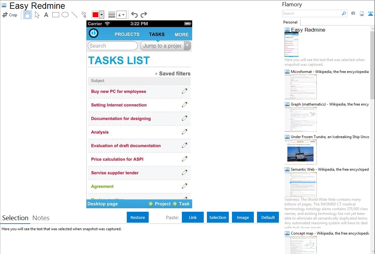 Flamory helps you capture and store screenshots from Easy Redmine by pressing a single hotkey. It will be saved to a history, so you can continue doing your tasks without interruptions. Later, you can edit the screenshot: crop, resize, add labels and highlights. After that, you can paste the screenshot into any other document or e-mail message.