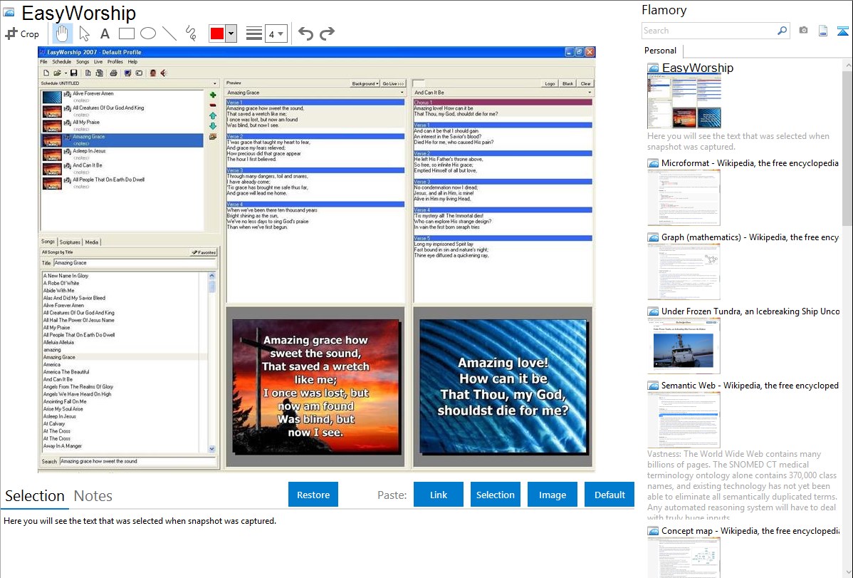 Flamory helps you capture and store screenshots from EasyWorship by pressing a single hotkey. It will be saved to a history, so you can continue doing your tasks without interruptions. Later, you can edit the screenshot: crop, resize, add labels and highlights. After that, you can paste the screenshot into any other document or e-mail message.