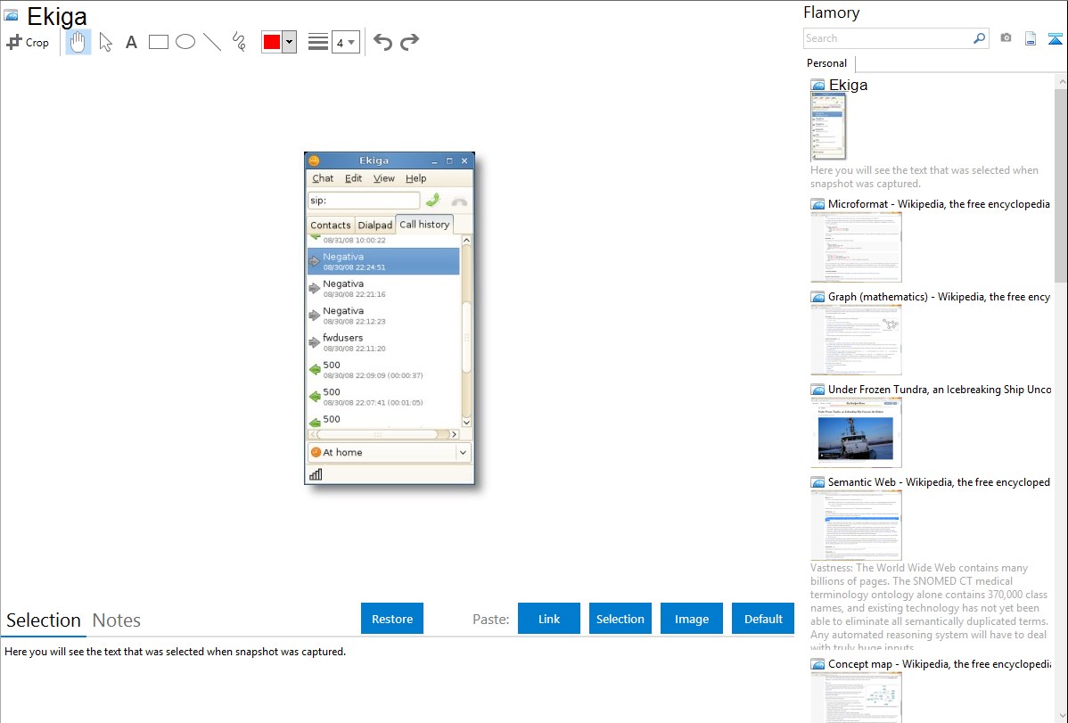 Flamory helps you capture and store screenshots from Ekiga by pressing a single hotkey. It will be saved to a history, so you can continue doing your tasks without interruptions. Later, you can edit the screenshot: crop, resize, add labels and highlights. After that, you can paste the screenshot into any other document or e-mail message.