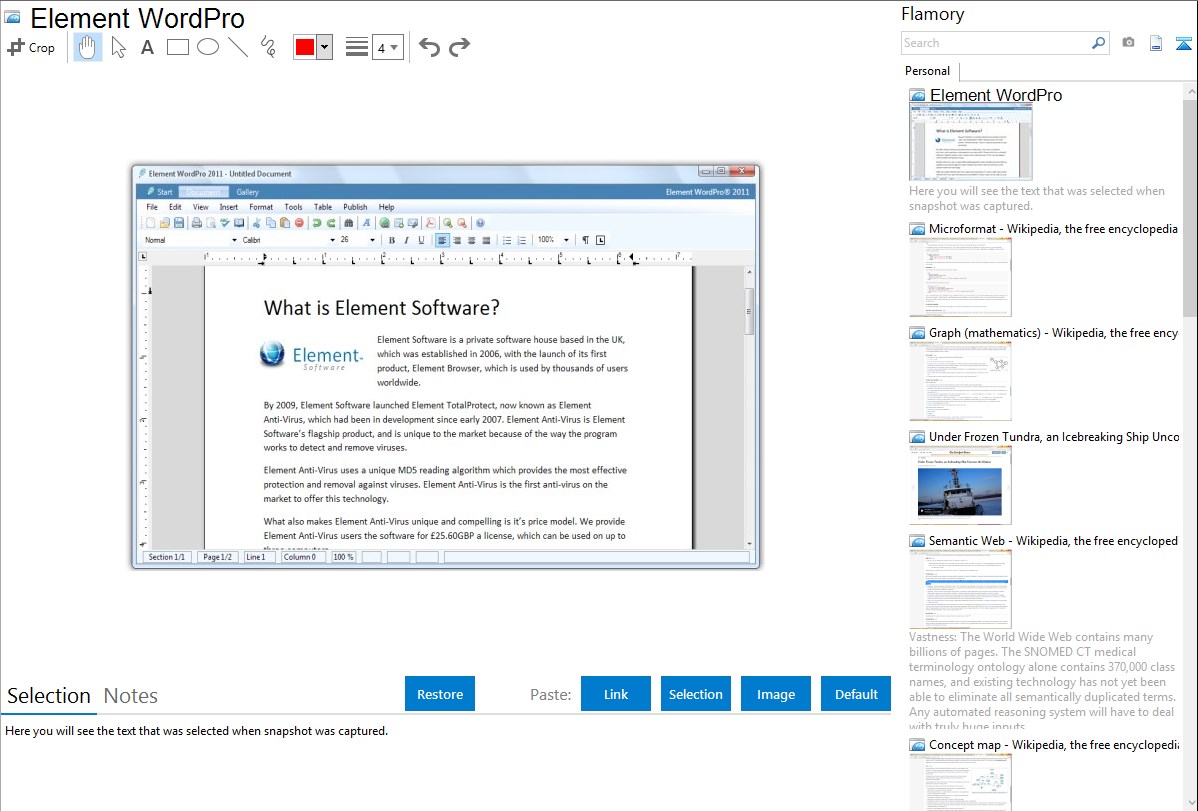 Flamory helps you capture and store screenshots from Element WordPro by pressing a single hotkey. It will be saved to a history, so you can continue doing your tasks without interruptions. Later, you can edit the screenshot: crop, resize, add labels and highlights. After that, you can paste the screenshot into any other document or e-mail message.