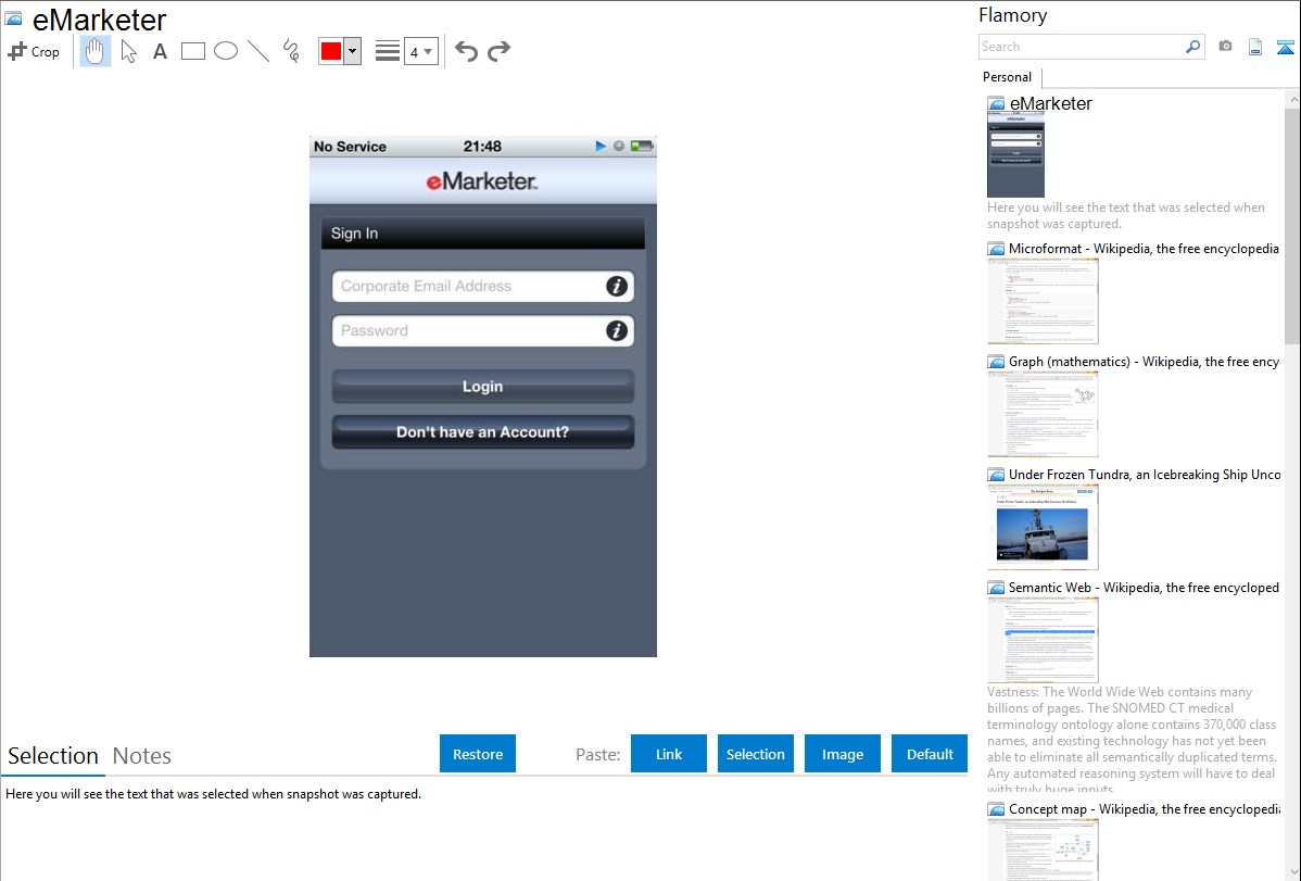 Flamory helps you capture and store screenshots from eMarketer by pressing a single hotkey. It will be saved to a history, so you can continue doing your tasks without interruptions. Later, you can edit the screenshot: crop, resize, add labels and highlights. After that, you can paste the screenshot into any other document or e-mail message.