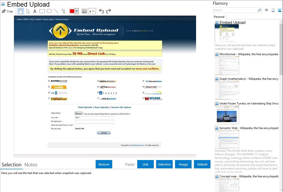 Flamory helps you capture and store screenshots from Embed Upload by pressing a single hotkey. It will be saved to a history, so you can continue doing your tasks without interruptions. Later, you can edit the screenshot: crop, resize, add labels and highlights. After that, you can paste the screenshot into any other document or e-mail message.