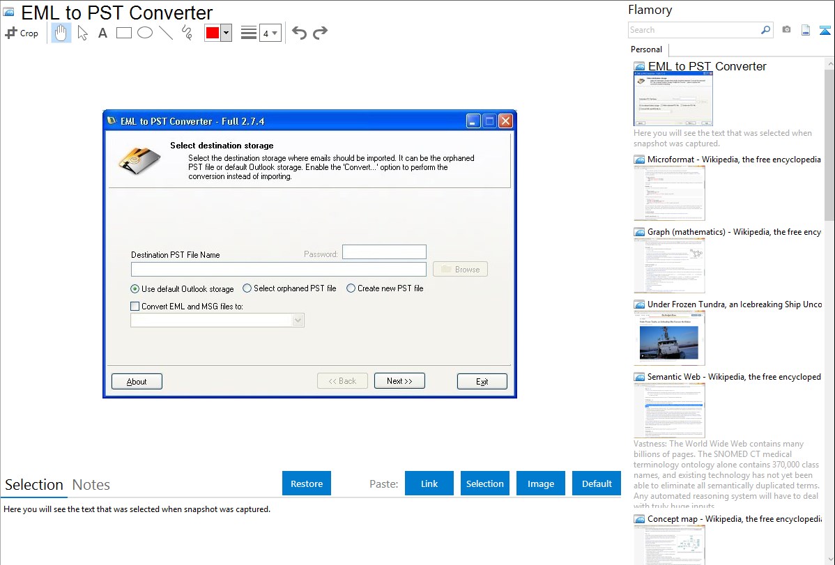 Flamory helps you capture and store screenshots from EML to PST Converter by pressing a single hotkey. It will be saved to a history, so you can continue doing your tasks without interruptions. Later, you can edit the screenshot: crop, resize, add labels and highlights. After that, you can paste the screenshot into any other document or e-mail message.