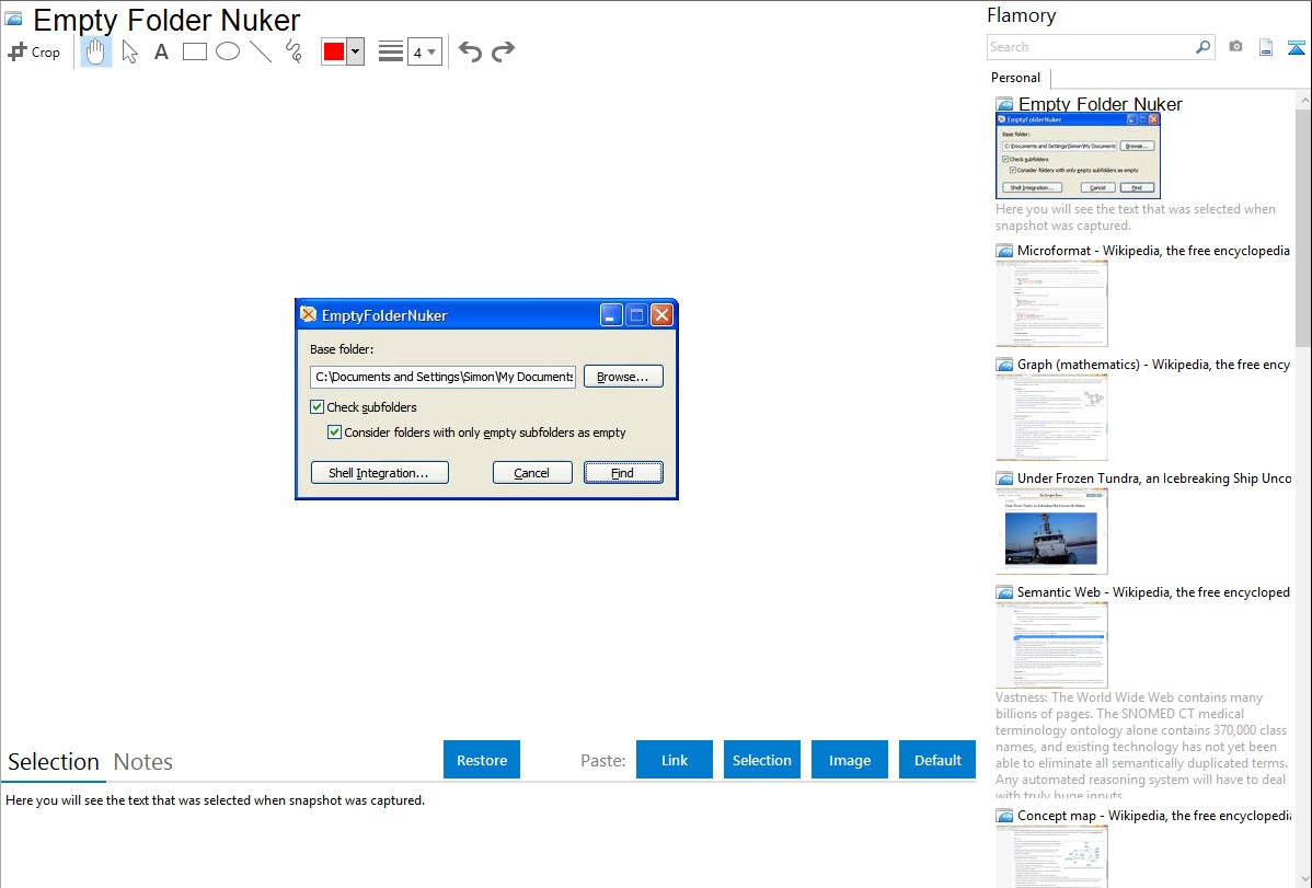 Flamory helps you capture and store screenshots from Empty Folder Nuker by pressing a single hotkey. It will be saved to a history, so you can continue doing your tasks without interruptions. Later, you can edit the screenshot: crop, resize, add labels and highlights. After that, you can paste the screenshot into any other document or e-mail message.