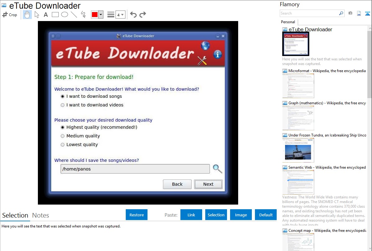 Flamory helps you capture and store screenshots from eTube Downloader by pressing a single hotkey. It will be saved to a history, so you can continue doing your tasks without interruptions. Later, you can edit the screenshot: crop, resize, add labels and highlights. After that, you can paste the screenshot into any other document or e-mail message.