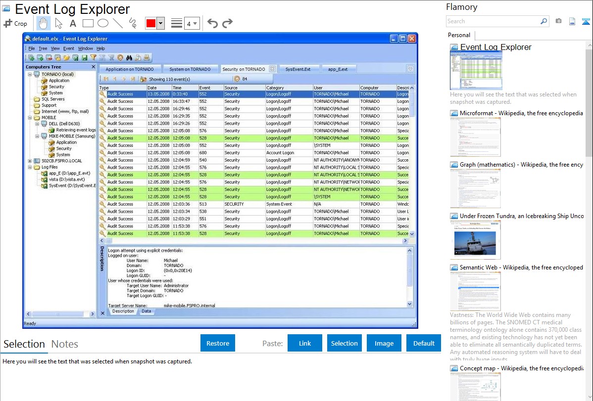 Flamory helps you capture and store screenshots from Event Log Explorer by pressing a single hotkey. It will be saved to a history, so you can continue doing your tasks without interruptions. Later, you can edit the screenshot: crop, resize, add labels and highlights. After that, you can paste the screenshot into any other document or e-mail message.