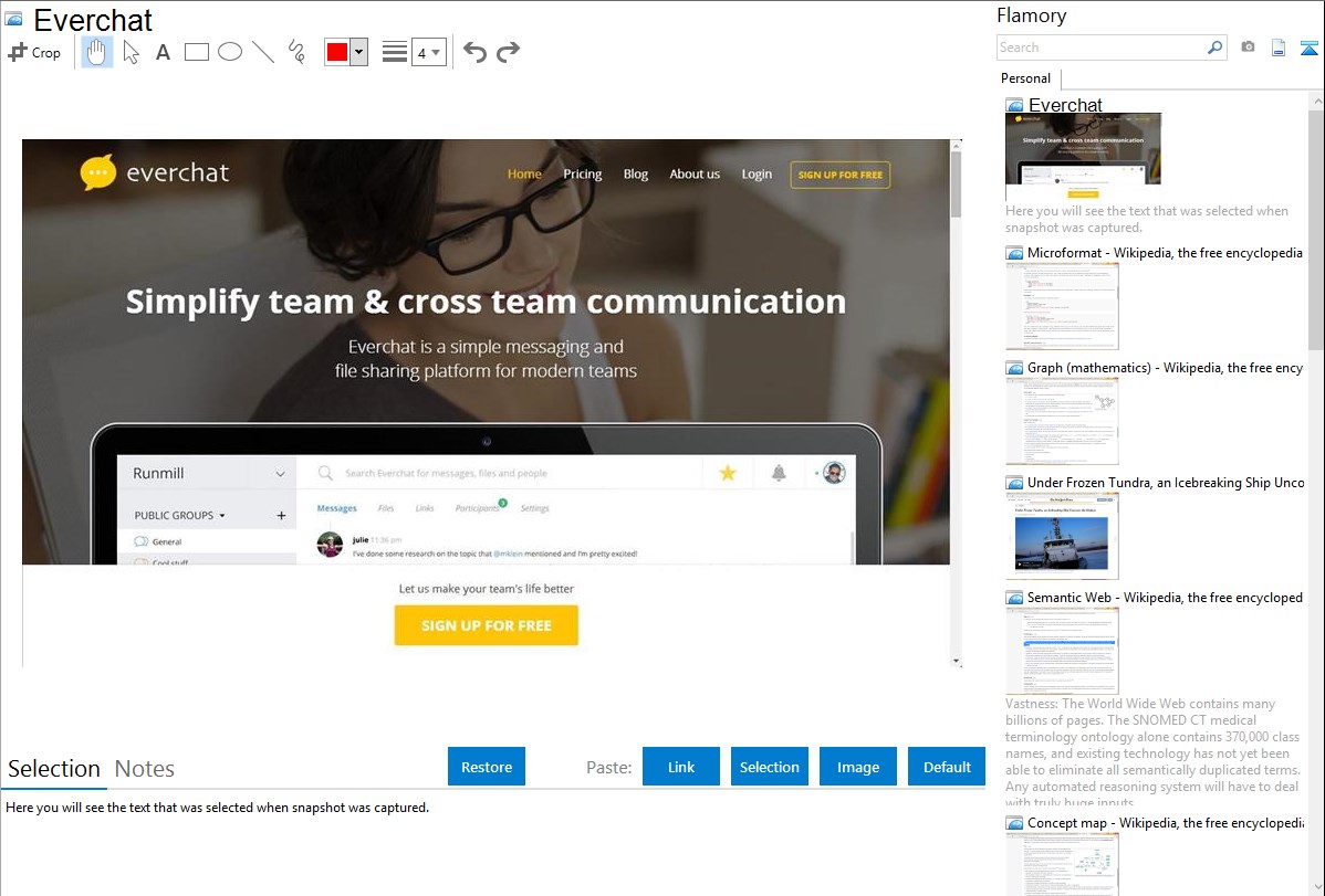 Flamory helps you capture and store screenshots from Everchat by pressing a single hotkey. It will be saved to a history, so you can continue doing your tasks without interruptions. Later, you can edit the screenshot: crop, resize, add labels and highlights. After that, you can paste the screenshot into any other document or e-mail message.