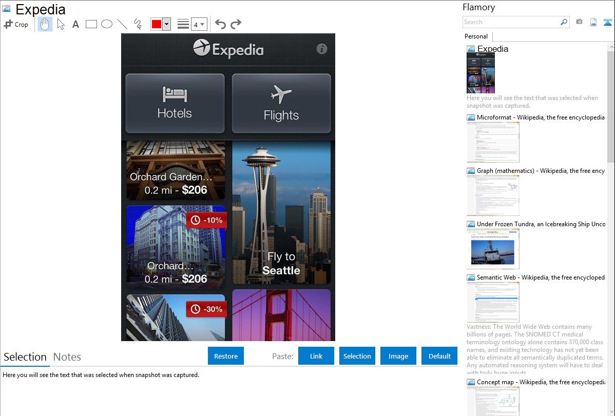 Flamory helps you capture and store screenshots from Expedia by pressing a single hotkey. It will be saved to a history, so you can continue doing your tasks without interruptions. Later, you can edit the screenshot: crop, resize, add labels and highlights. After that, you can paste the screenshot into any other document or e-mail message.