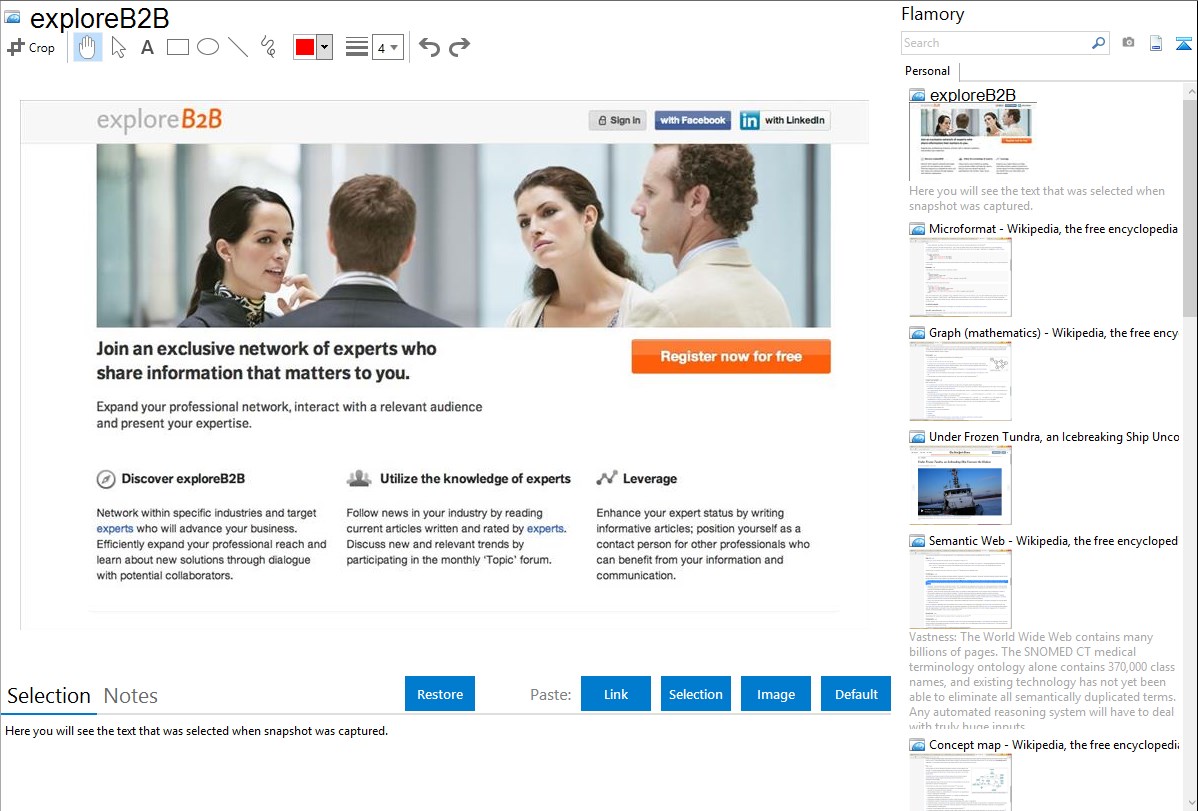 Flamory helps you capture and store screenshots from exploreB2B by pressing a single hotkey. It will be saved to a history, so you can continue doing your tasks without interruptions. Later, you can edit the screenshot: crop, resize, add labels and highlights. After that, you can paste the screenshot into any other document or e-mail message.