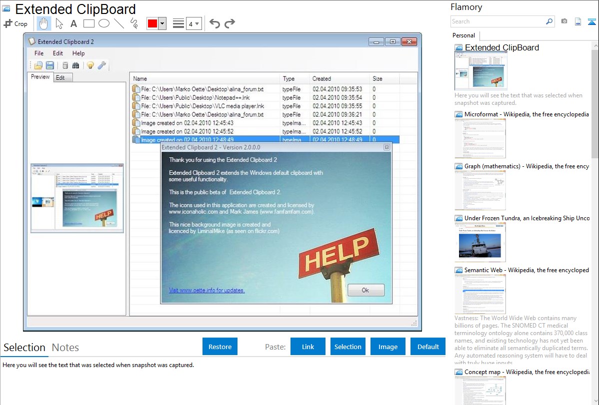 Flamory helps you capture and store screenshots from Extended ClipBoard by pressing a single hotkey. It will be saved to a history, so you can continue doing your tasks without interruptions. Later, you can edit the screenshot: crop, resize, add labels and highlights. After that, you can paste the screenshot into any other document or e-mail message.