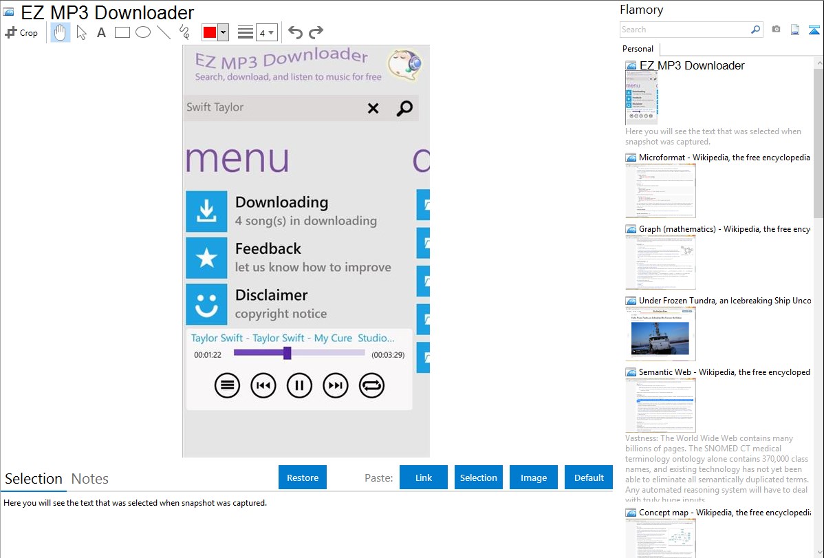 Flamory helps you capture and store screenshots from EZ MP3 Downloader by pressing a single hotkey. It will be saved to a history, so you can continue doing your tasks without interruptions. Later, you can edit the screenshot: crop, resize, add labels and highlights. After that, you can paste the screenshot into any other document or e-mail message.