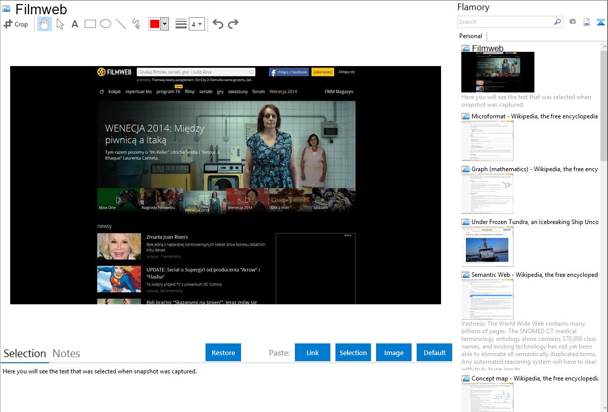 Flamory helps you capture and store screenshots from Filmweb by pressing a single hotkey. It will be saved to a history, so you can continue doing your tasks without interruptions. Later, you can edit the screenshot: crop, resize, add labels and highlights. After that, you can paste the screenshot into any other document or e-mail message.