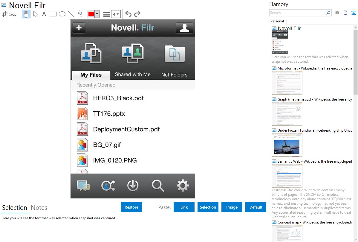 Flamory helps you capture and store screenshots from Novell Filr by pressing a single hotkey. It will be saved to a history, so you can continue doing your tasks without interruptions. Later, you can edit the screenshot: crop, resize, add labels and highlights. After that, you can paste the screenshot into any other document or e-mail message.