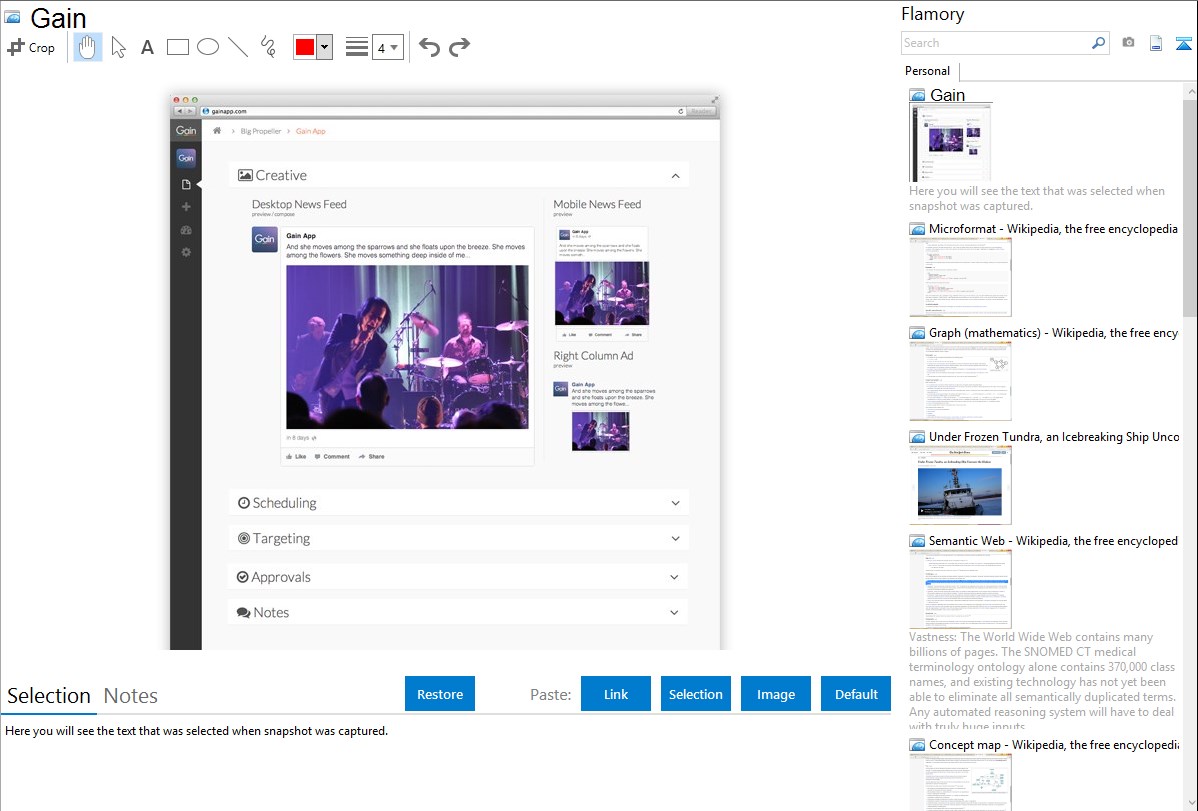 Flamory helps you capture and store screenshots from Gain by pressing a single hotkey. It will be saved to a history, so you can continue doing your tasks without interruptions. Later, you can edit the screenshot: crop, resize, add labels and highlights. After that, you can paste the screenshot into any other document or e-mail message.