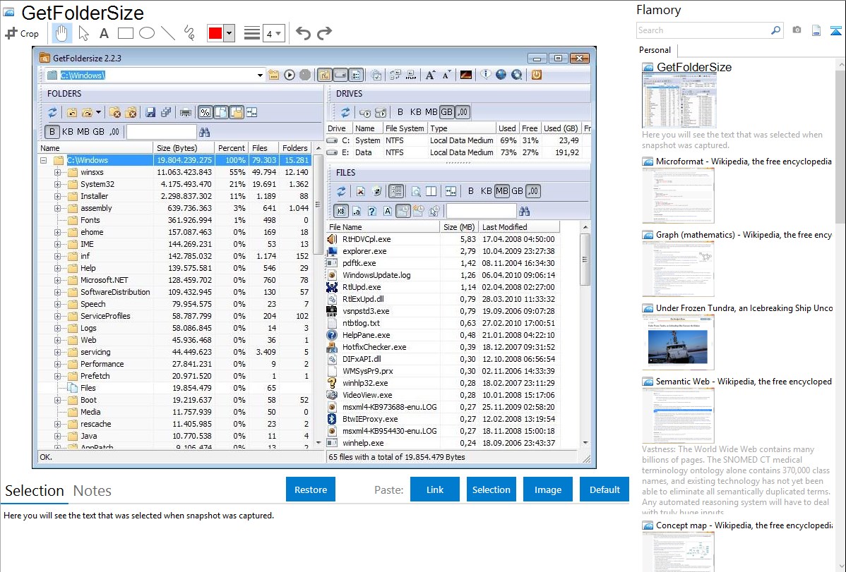 Flamory helps you capture and store screenshots from GetFolderSize by pressing a single hotkey. It will be saved to a history, so you can continue doing your tasks without interruptions. Later, you can edit the screenshot: crop, resize, add labels and highlights. After that, you can paste the screenshot into any other document or e-mail message.