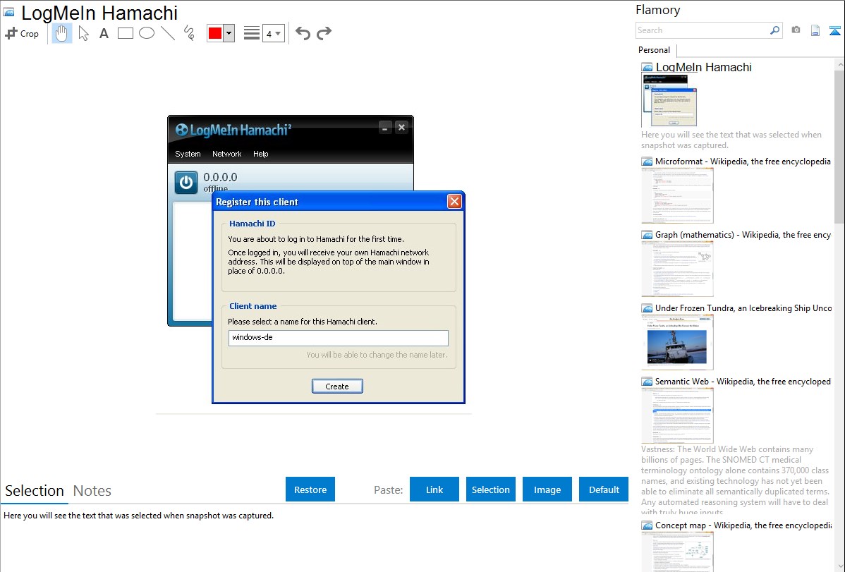 Flamory helps you capture and store screenshots from LogMeIn Hamachi by pressing a single hotkey. It will be saved to a history, so you can continue doing your tasks without interruptions. Later, you can edit the screenshot: crop, resize, add labels and highlights. After that, you can paste the screenshot into any other document or e-mail message.