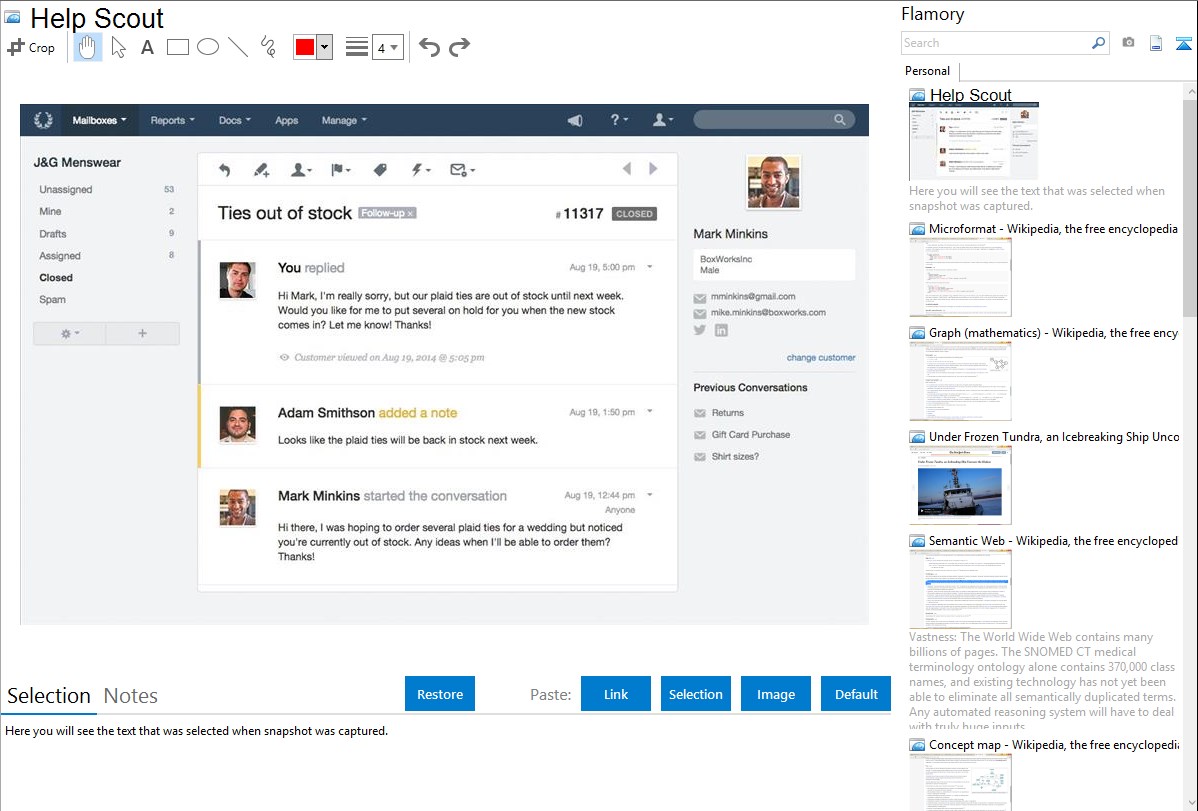 Flamory helps you capture and store screenshots from Help Scout by pressing a single hotkey. It will be saved to a history, so you can continue doing your tasks without interruptions. Later, you can edit the screenshot: crop, resize, add labels and highlights. After that, you can paste the screenshot into any other document or e-mail message.