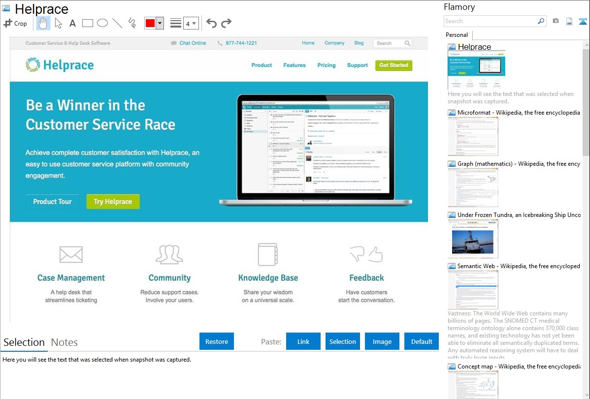 Flamory provides advanced bookmarking for Helprace. It captures screen, selection, text on the page and other context. You can find this bookmark later using search by page content or looking through thumbnail list.