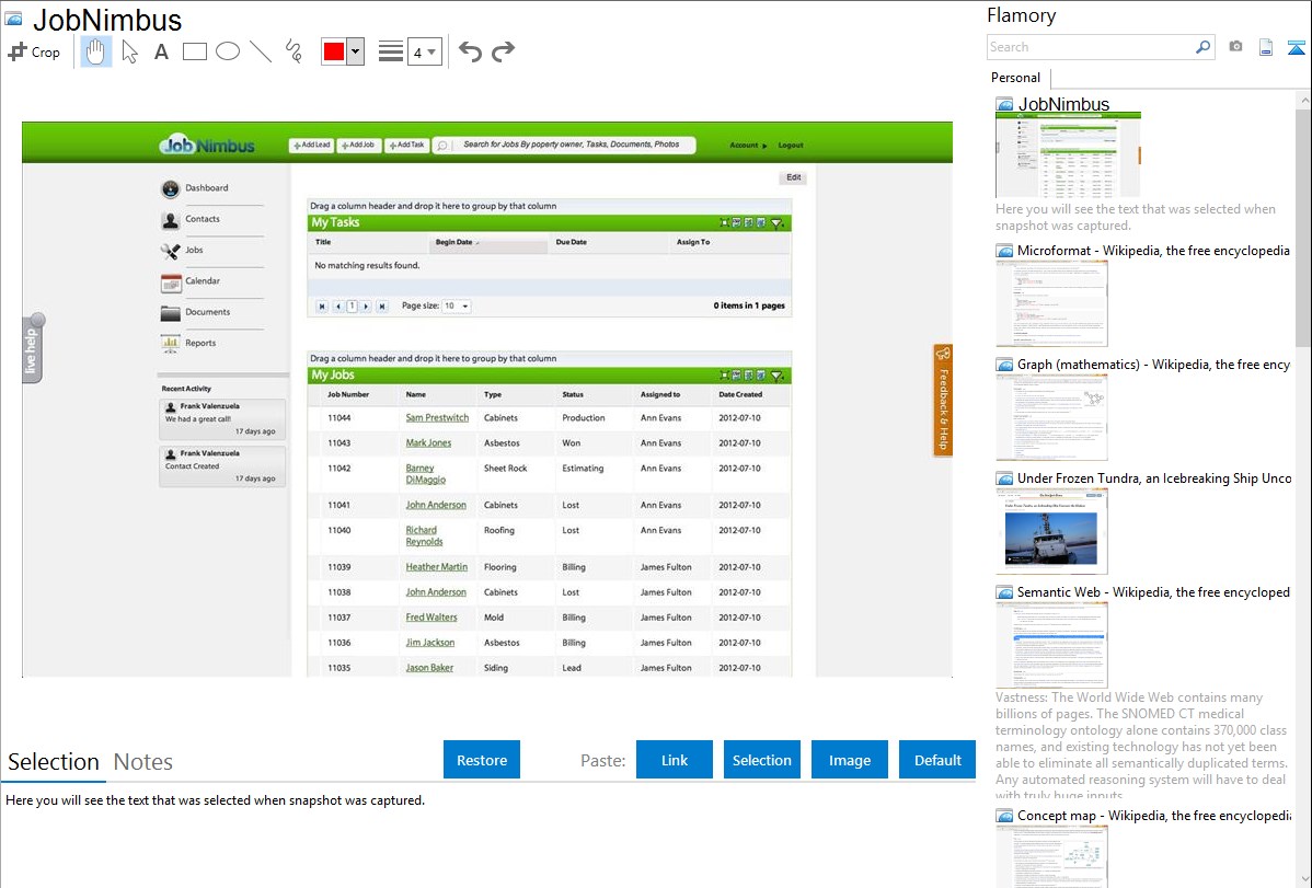 Flamory helps you capture and store screenshots from JobNimbus by pressing a single hotkey. It will be saved to a history, so you can continue doing your tasks without interruptions. Later, you can edit the screenshot: crop, resize, add labels and highlights. After that, you can paste the screenshot into any other document or e-mail message.