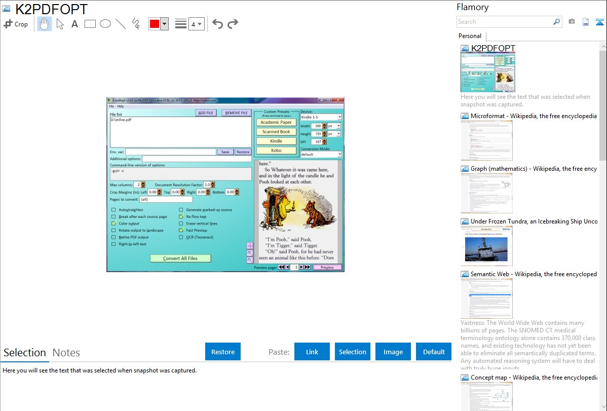 Flamory helps you capture and store screenshots from K2PDFOPT by pressing a single hotkey. It will be saved to a history, so you can continue doing your tasks without interruptions. Later, you can edit the screenshot: crop, resize, add labels and highlights. After that, you can paste the screenshot into any other document or e-mail message.