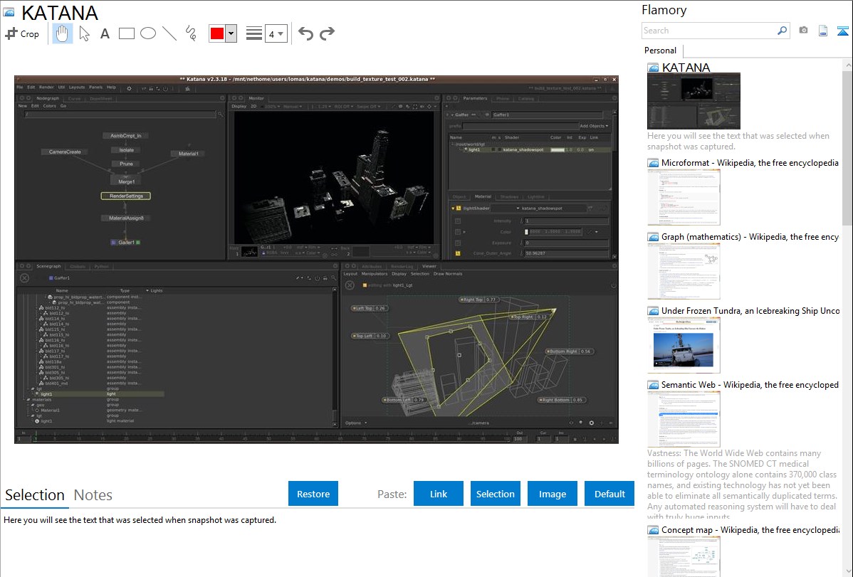 Flamory helps you capture and store screenshots from KATANA by pressing a single hotkey. It will be saved to a history, so you can continue doing your tasks without interruptions. Later, you can edit the screenshot: crop, resize, add labels and highlights. After that, you can paste the screenshot into any other document or e-mail message.